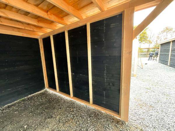 Wanden: zwart geïmpregneerd Zweeds rabat op vuren regelwerk (45x60 mm) – rabatdelen worden bij montage op maat gezaagd
